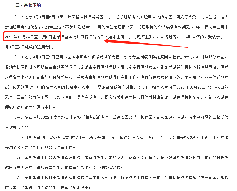 (一)对于9月3日至5日中级会计资格考试停考考区,统一组织延期考试。延期考试的考区,可为符合条件的考生提供是否参加延期考试的选择。如考生选择不参加延期考试,可为考生退还报名费并将已取得的合格成绩有效期延长1年。相关考生可于2022年10月24日至11月6日登录“全国会计资格评价网”(如未注册,须先完成注册),申请退费。未按时申请的,默认参加12月3日至4日组织的延期考试。