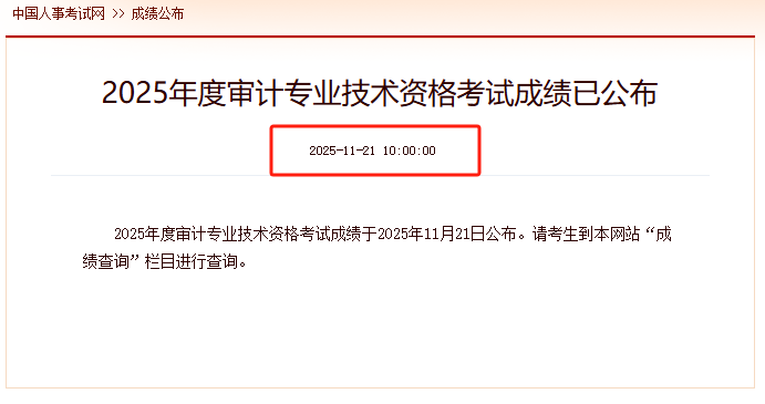 根据中国人事考试网11月21日发布的《2025年度审计专业技术资格考试成绩已公布》通知,2025年中级审计师考试成绩查询入口已于11月21日正式开通。考生可登录中国人事考试网(http://www.cpta.com.cn/)查询个人成绩,本次考试各科目合格标准均为60分(满分100分)。