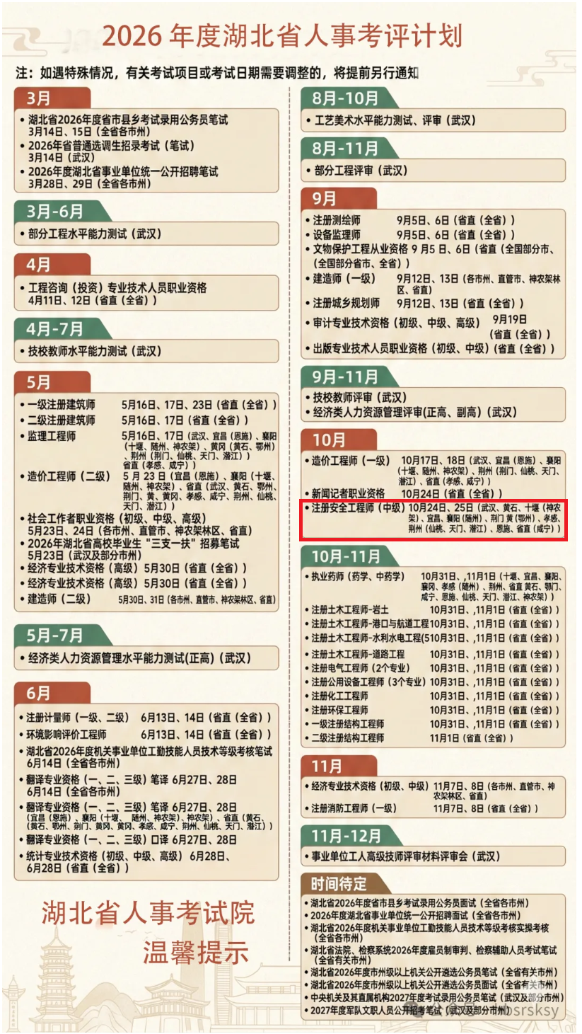 近日,湖北省人事考试院正式公布了《2026年度湖北省人事考评日历》,备受关注的2026年度湖北中级注册安全工程师职业资格考试时间尘埃落定。根据官方安排,本年度考试将于10月24日至25日在全国范围内同步进行。为方便广大考生应考,湖北省共设立了12个考区,全面覆盖主要地市州。以下是针对本次考务安排的详细解读及备考指南。