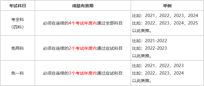 免试2个科目(级别为“免二科”)的人员必须在连续的2个考试年度内通过应试科目。