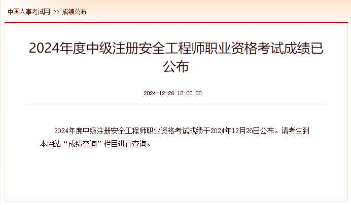 2024年度中级注册安全工程师职业资格考试成绩于2024年12月26日公布,请考生到中国人事考试网(http://www.cpta.com.cn/index.html)“成绩查询”栏目进行查询。