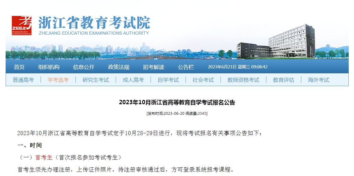 2023年10月浙江省高等教育自学考试定于10月28-29日进行,现将考试报名有关事项公告如下: