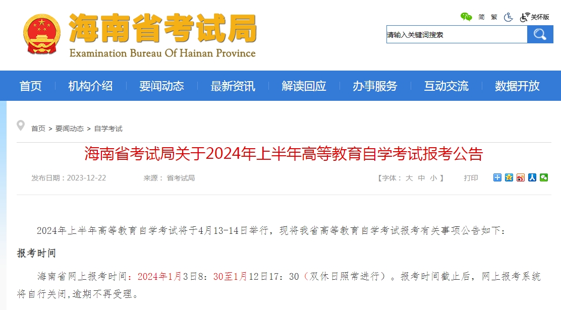 海南省网上报考时间:2024年1月3日8:30至1月12日17:30(双休日照常进行)。报考时间截止后,网上报考系统将自行关闭,逾期不再受理。