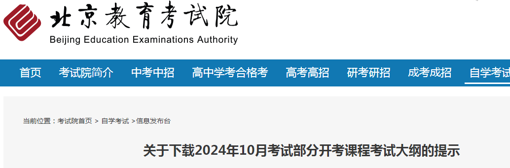 根据北京教育考试院发布的《关于下载2024年10月考试部分开考课程考试大纲的提示》可知,2024年10月考试部分开考课程考试大纲已发布,请参考人员及时下载。