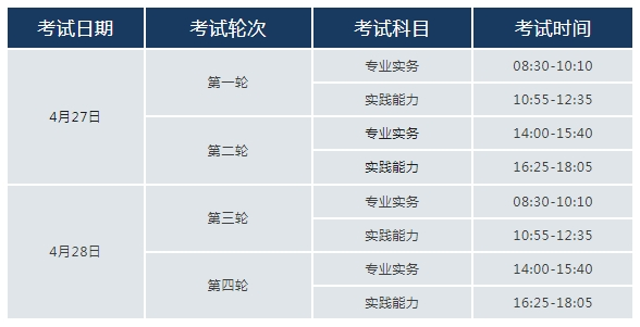 长春考点考试时间为4月27日、28日,每名考生参加其中1个轮次2个科目(半天)的考试,具体考试时间、考试地点请注意查看本人准考证,切勿错过考试时间。