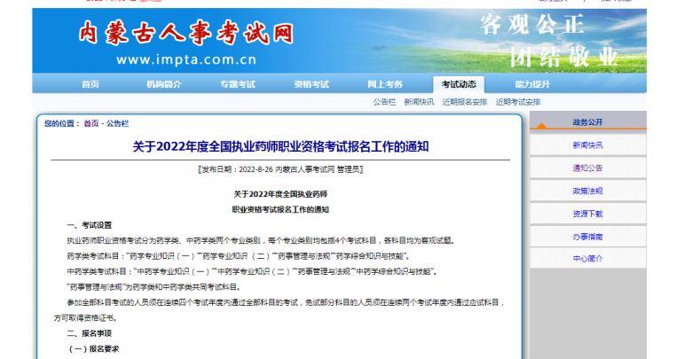 内蒙古人事考试网发布的《关于2022年度全国执业药师职业资格考试报名工作的通知》