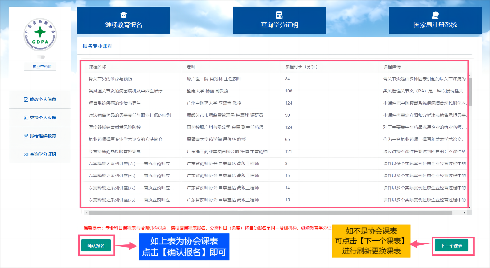 2、登录成功后,核实或完善个人信息和个人头像,然后选择“继续教育报名”,点击选择学习年份(2024),选择广东省药师协会课程列表(见下表截图,不同的课程代表不同的施教机构),确认报名,点击跳转。