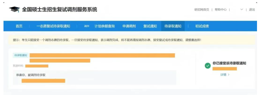 考生只能接受一个调剂志愿的待录取,一旦接受待录取通知,表示调剂完成,将不能再填报调剂志愿、接受复试或待录取通知,请慎重选择。