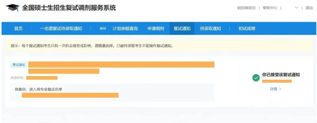 考生提交调剂志愿后,请及时登录调剂系统,查看志愿状态及是否接到复试通知。若接到复试通知,考生应在招生单位规定时间内登录调剂系统进行确认,未按时确认的,招生单位可能取消考生复试通知。若确认参加复试,考生应按照招生单位要求办理相关手续。