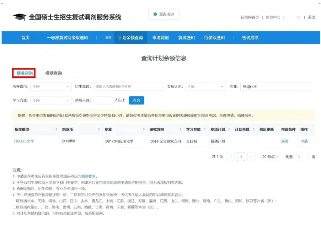 3.查询余额时,若使用精确查询,招生单位、专业至少填写一项;若使用模糊查询,必须选择所在省市与学科专业。